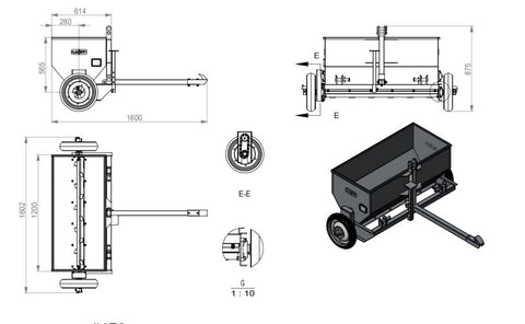 Type T-SPR-250 Salt Spreader fitted with Tow bar (optional), 3-point suspension cat. The spreader rotor is driven via the left wheel, and is fitted with studded tires which deactivate the drive on the roller when moving in reverse. The rotor action is deactivated via a fitting on the wheel.